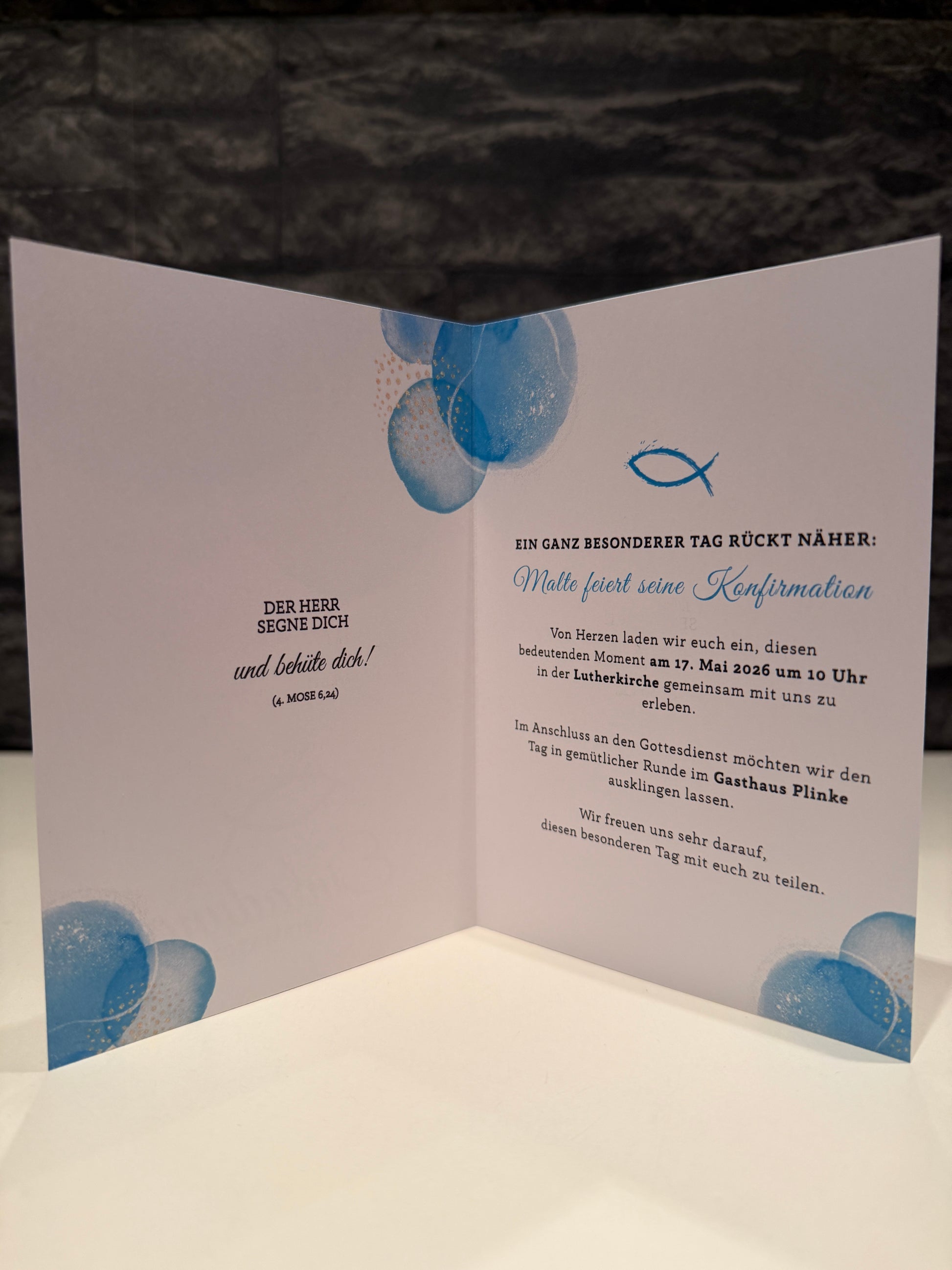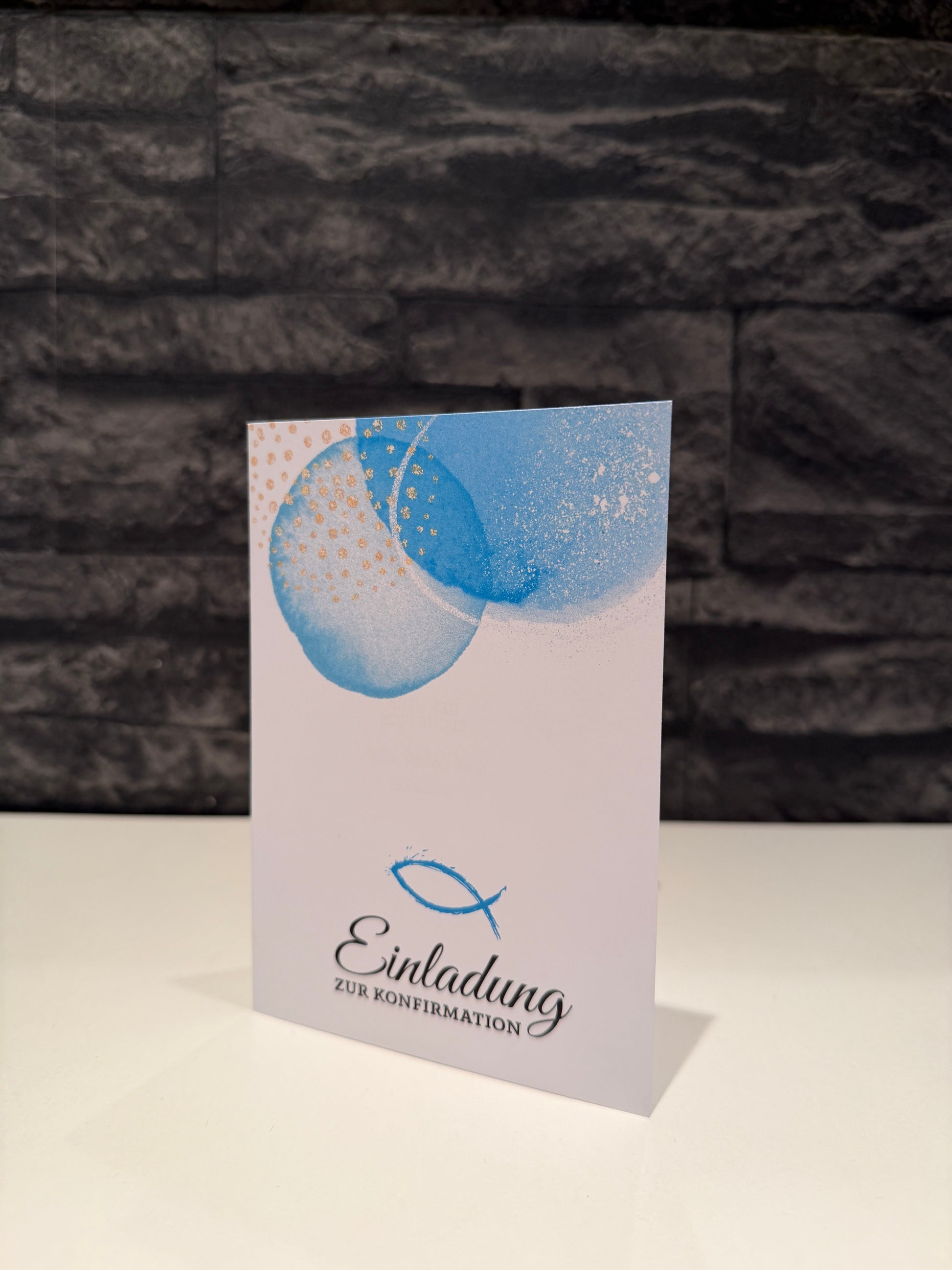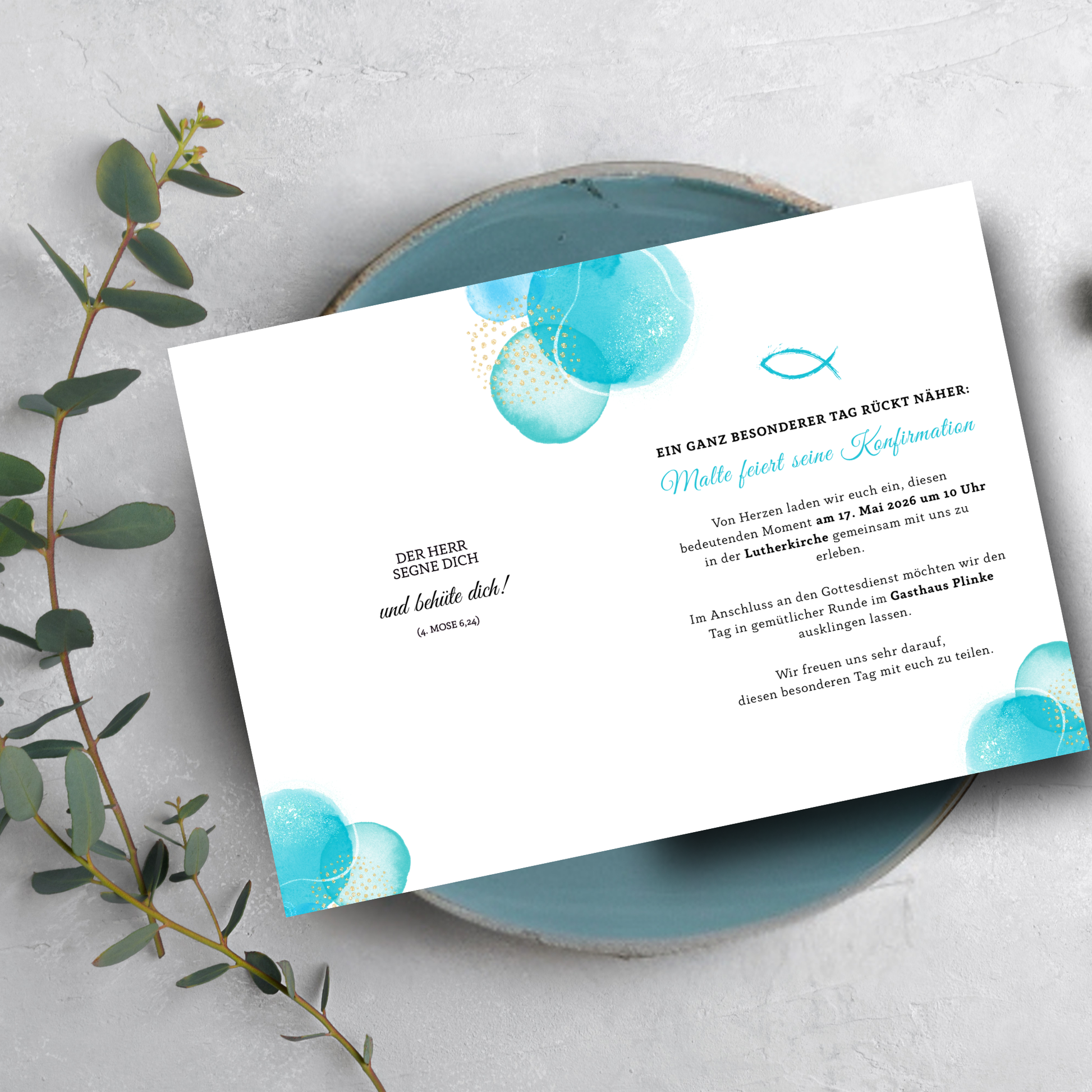 Das moderne Aquarell-Design in Blau- und Türkistönen mit feinen goldfarbenen Akzenten verleiht der Karte eine ruhige, elegante Ausstrahlung. Das dezente christliche Symbol (Fisch) macht sie ideal für kirchliche Feiern.
